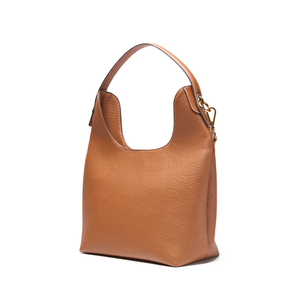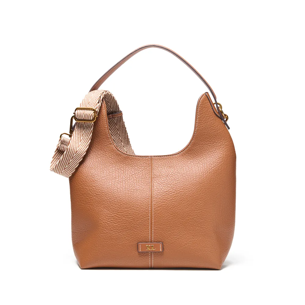 Logo XL metálico aplicado al frente.SKU: LIMAY BANDOLERA CHICA BEIGE -